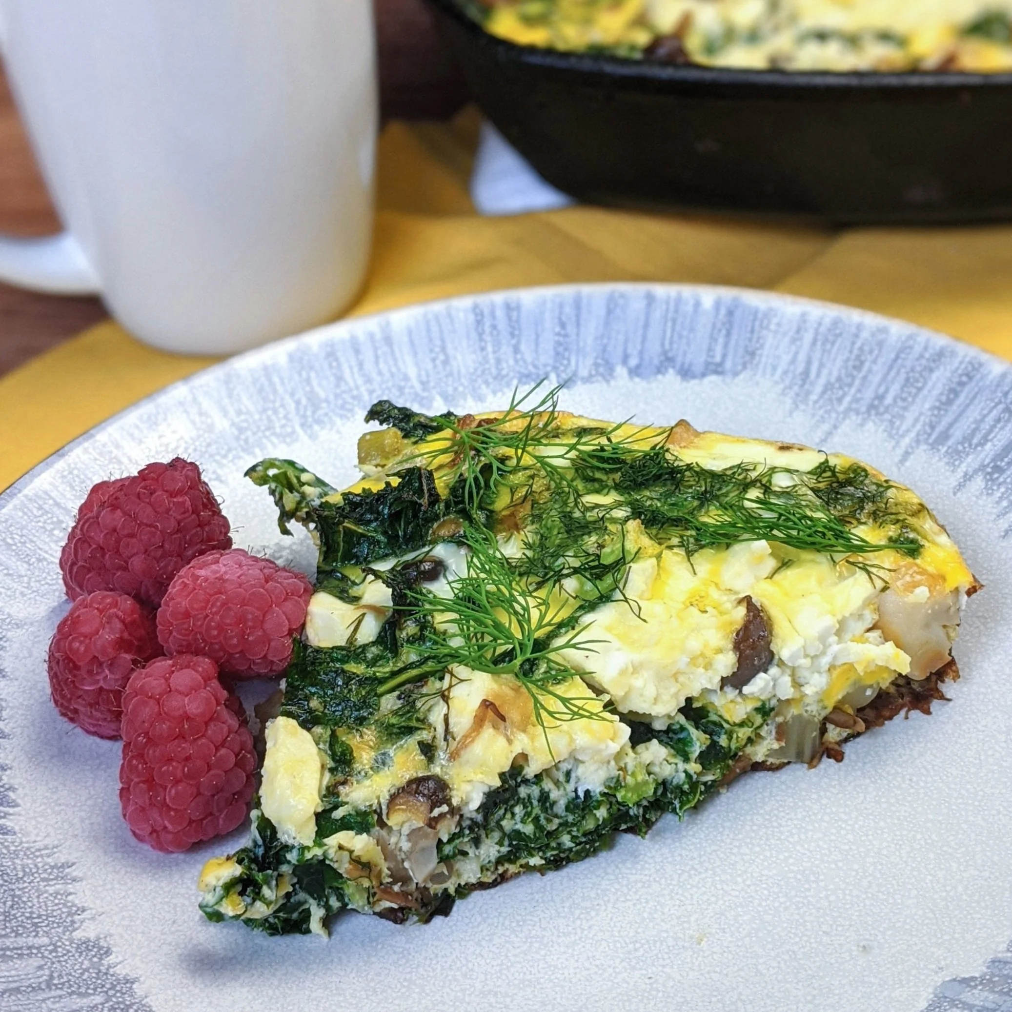 Pour in the prepared egg mixture and top with crumbled feta cheese and chopped dill. Continue to cook, without stirring, until the edges start to pull away from the sides of the pan, about 5 minutes. Transfer skillet to the oven and bake until set, 15-18 minutes. Remove from the oven, let cool slightly, and slice into 6 or 8 equal pieces. Garnish with chopped dill and enjoy warm or cold.