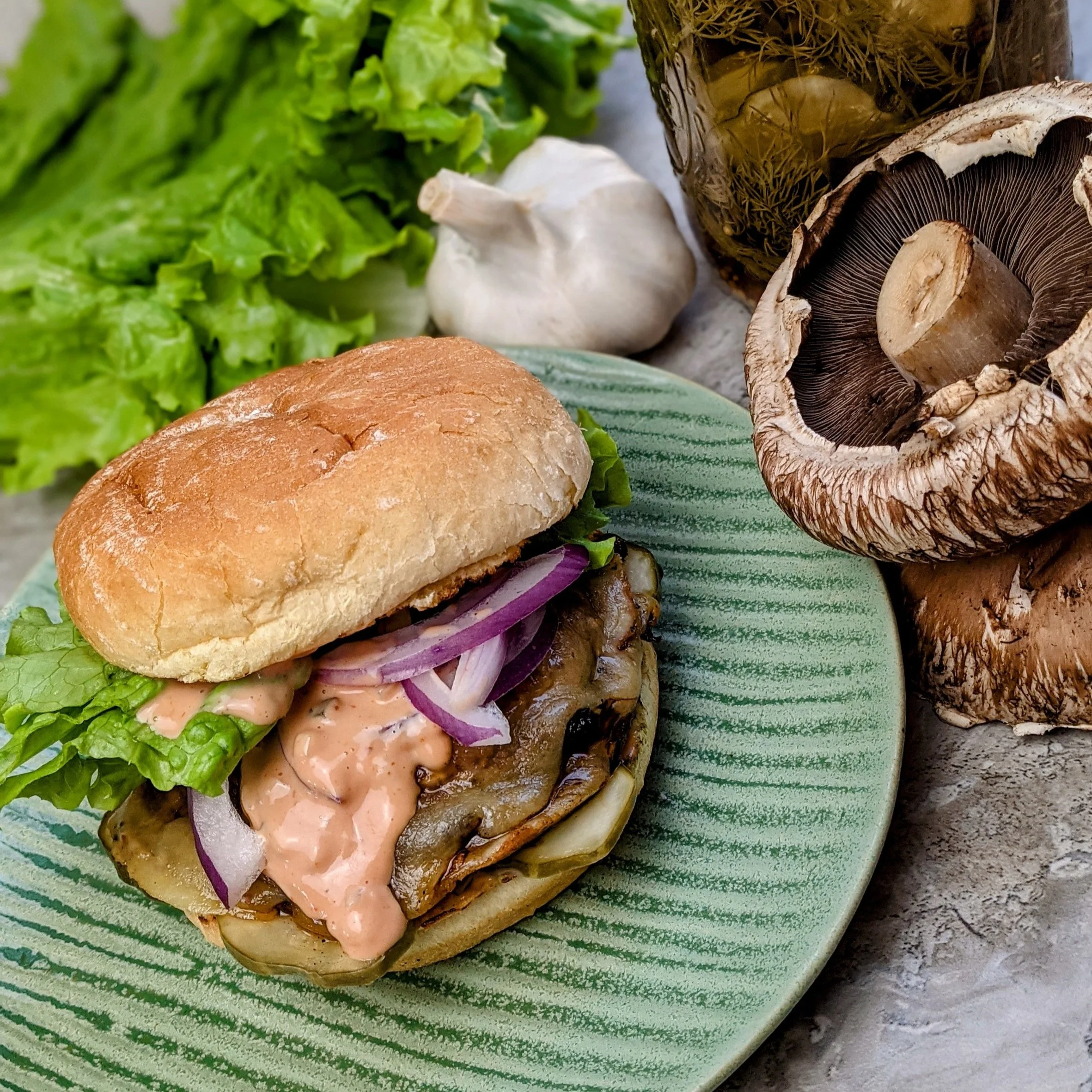Meaty Portabella mushrooms truly shine when marinated and seared on a hot cast-iron skillet or grill. Topped with sharp cheddar cheese, or vegan cheese, with burger sauce and all the classic fixings. You won’t miss the hefty beef patties at all!