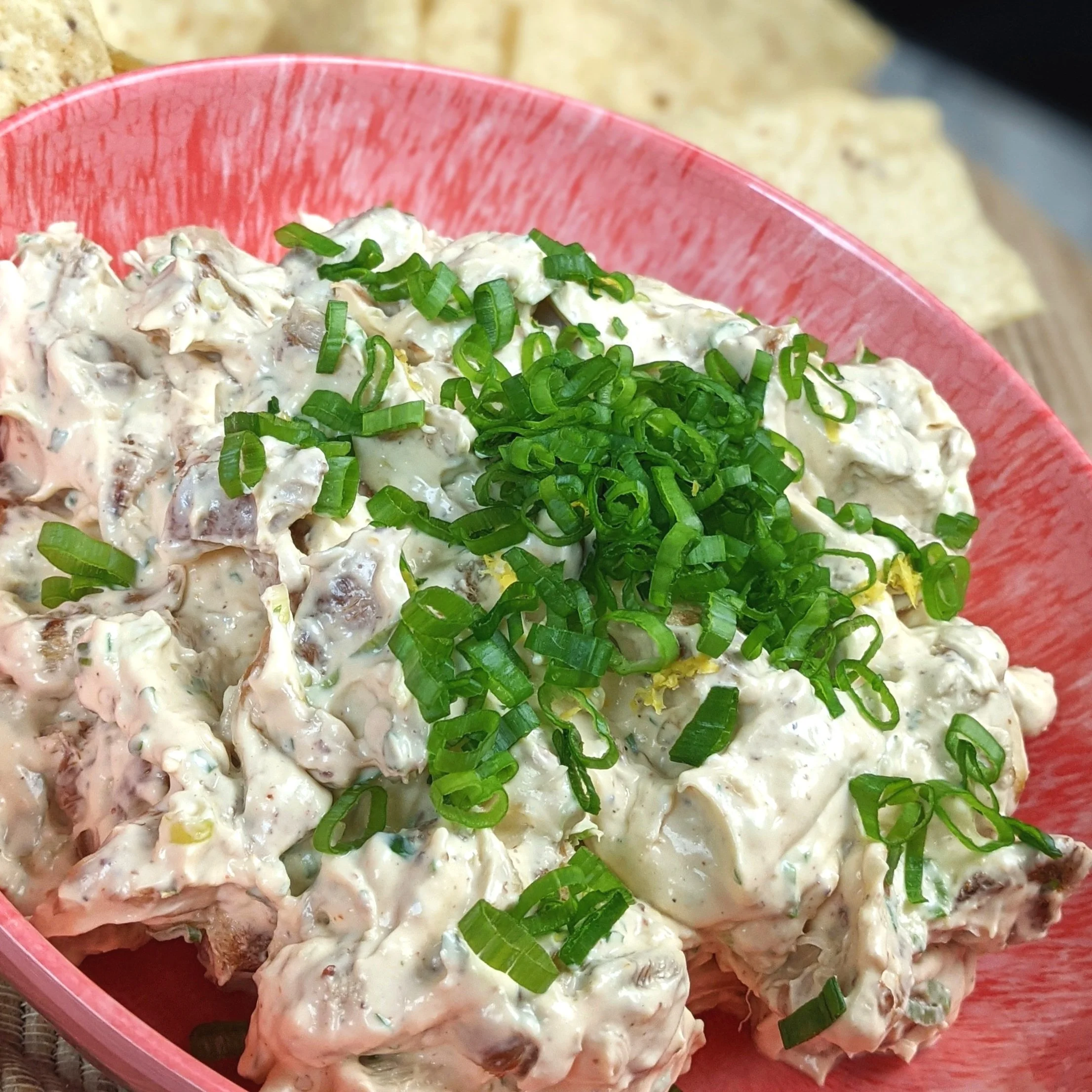 Fold in chopped parsley and cooled Lion’s Mane mushrooms. Adjust seasoning with more Cajun spice, if necessary. Place mixture into a serving bowl, garnish with some extra thinly sliced scallions, and enjoy with your chip of choice!