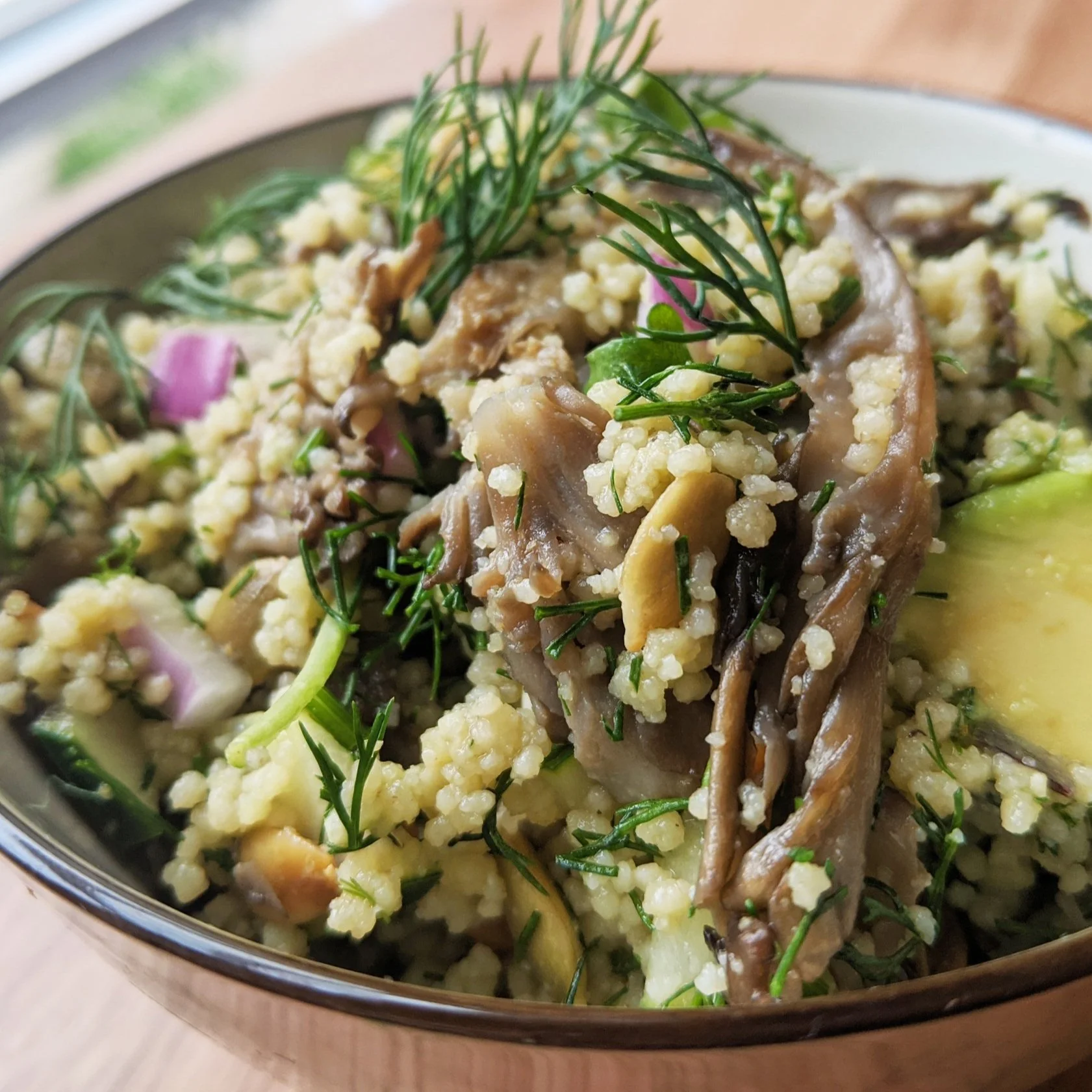 This delicious vegan salad uses Maitake mushrooms as a savory base that is brightened by lemon juice and fresh herbs. The salad is completely customizable, so try it with different additions, may the farmers market be your guide!