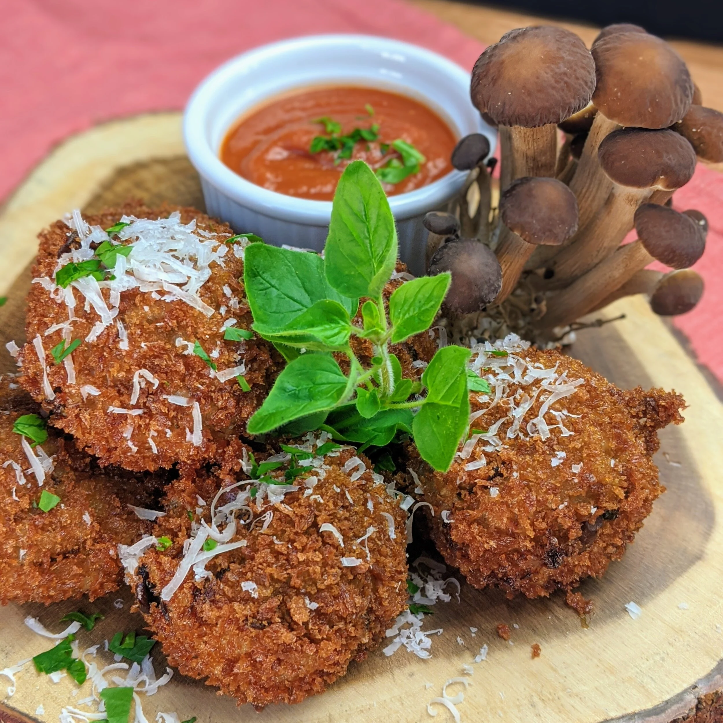 Pour at least 4 inches of vegetable oil into a tall-sided saucepot and heat to 350 °F degrees. (Alternatively, a tabletop fryer works beautifully!) Meanwhile, place shredded mozzarella cheese and panko breadcrumbs in a small and medium bowl, respectively. Using a ⅓ cup, scoop chilled risotto into small mounds onto a large plate.