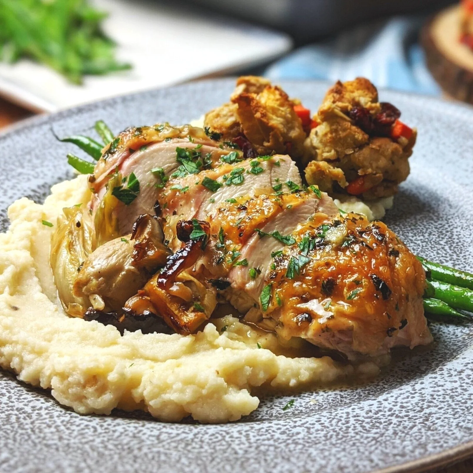 Try different aromatic vegetables while roasting, the essential couple is the mushrooms and chicken!